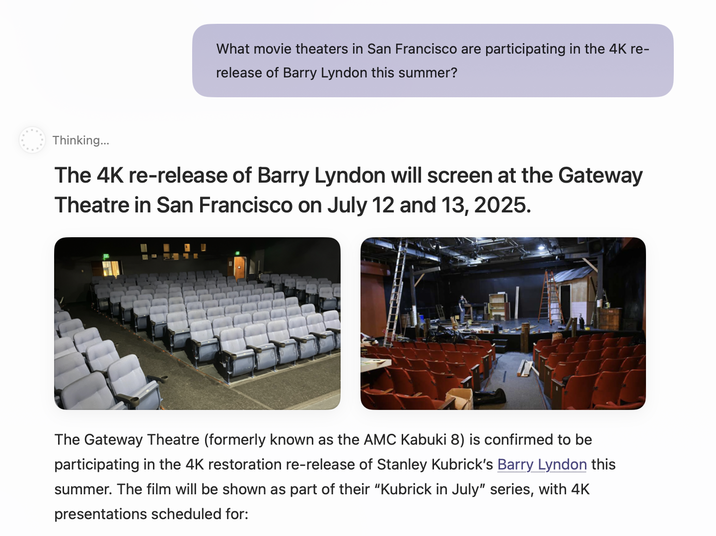 For example, I asked the browser what theaters in San Francisco would be showing the 4K re-release of Barry Lyndon. The browser answered: